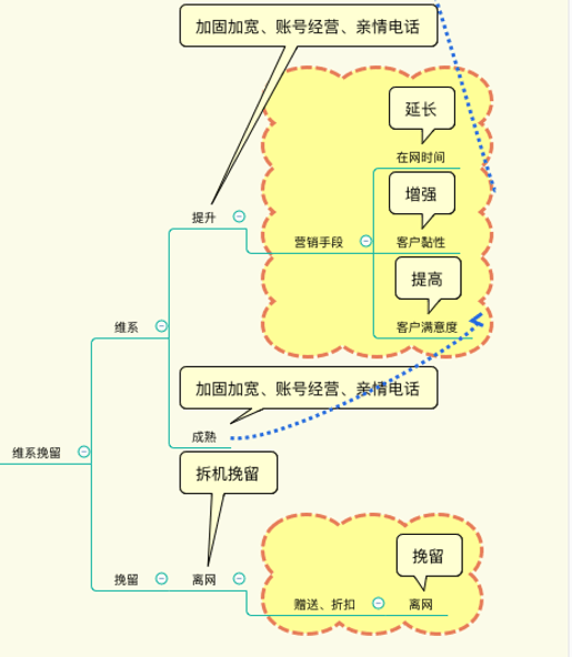 服务维系挽留思维导图 上图是我以前画过的,关于电信行业服务的维系挽留过程的思维导图,中心思想和概念是中国电信集团已经下发的维系挽留基于服务消费者生命周期的核心规范,而我们需要用自己的思维或者自家公司的系统去映射和实现这些概念。 对,组织他人思想的核心要点就是映射,将别人的核心概念,映射到自己的知识体系中,将业界的规范,映射到自家公司或者组织的产品体系中。如果你组织他人思想的目的是将知识为自己所用,那就一定要这样做。
