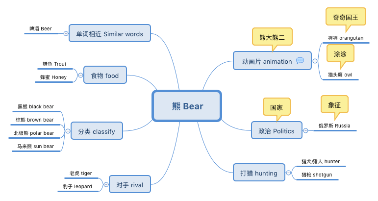 关于熊的记忆 小结:采用多维度联想记忆法,目前是比较常见的记忆手段,通过该记忆方法不光可以记忆一个中心事物,比如:熊 bear,而是可以记住一片相关事物,能记住那些,恰恰是大脑皮层最活跃的存储区域,如果你关心政治,记住的就是与熊相关的政治词汇,比如:“Russsia”,如果你关注电影,你记住的就是关于熊的电影等等。 思维导图的发散,多维的特征可以帮助你,实现对事物的关联自然记忆。用好思维导图就是把你对外界陌生信号放入你记忆最活跃的区域里,随时可以提取。