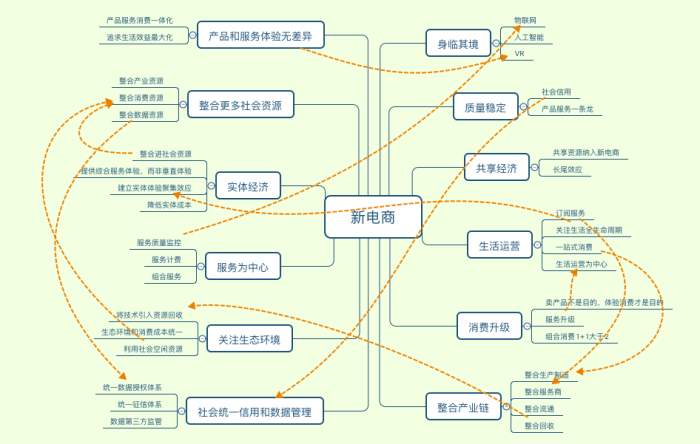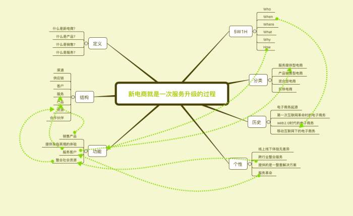 新电商的头脑风暴 在头脑风暴的制作过程中: 第一步是:快速发散思考与主题相关的词汇或者句子,没有条件约束,你几乎不用考虑是否可以实现,而是尽量把你能想到的都写下来作为分支主题,这里没有边界,你的思考边界就是这个中心主题的边界。 第二步是:进一步思考分支主题的构成因子,不用考虑分支主题下的维度约束(跨维度的思考),没有结构化限制。把你能想到的构成因子都写下来。 第三部是:建立这些叶子节点的关联关系(连接线),用大量的关系网络来关联这些创新观点。只要符合逻辑的关联都可以成立。 最后:你可以保留这些关联最为紧密的观点(连线最多的节点),作为下一步组织自己思想的原始素材(当然如果你有这个需求)。