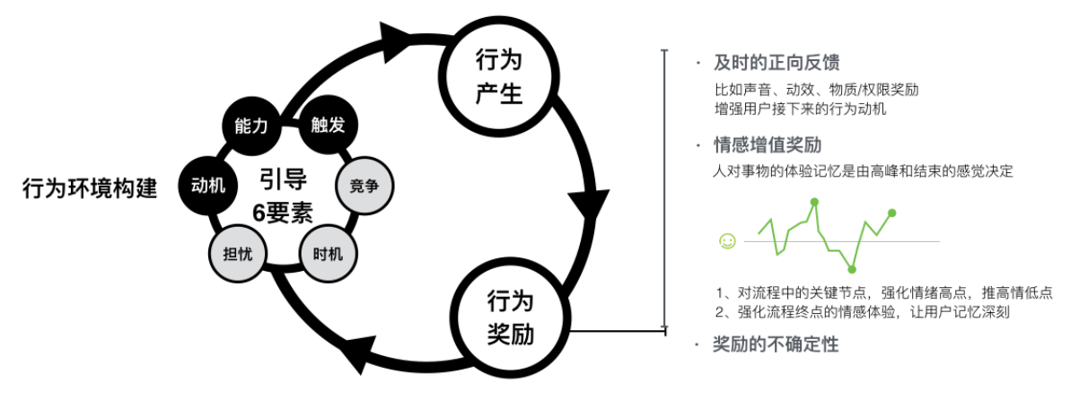 倘若综合考虑行为发生的整体链路,可以初步得到以下行为模型,从行为环境的构建→行为产生→行为奖励→增强下一次行为动机→行为发生的正向循环模式,对重复行为的习惯养成和一次复杂行为的完成均有效。