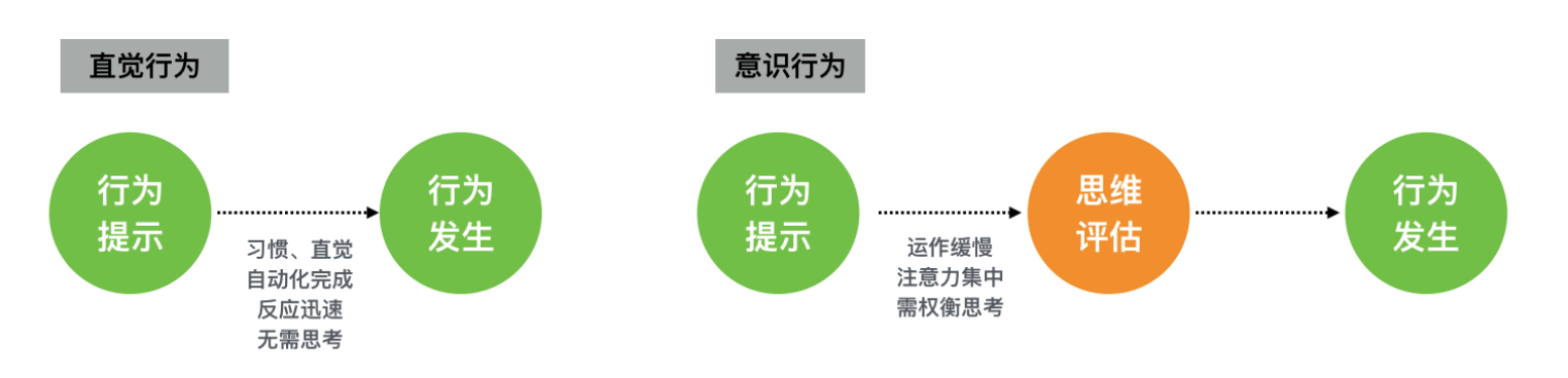 我们每天大多数行为的发生都属于直觉行为,它主要依托于习惯(已经习得的行为模式)、直觉(基于过去的经历、熟悉的场景做出快速的判断),其反应迅速,自动化完成,只需要一个简单的提示,行为就能即刻发生,比如闹钟响了就关闹钟,看到红色警示就能意识到危险等,基本不需要思考加工。