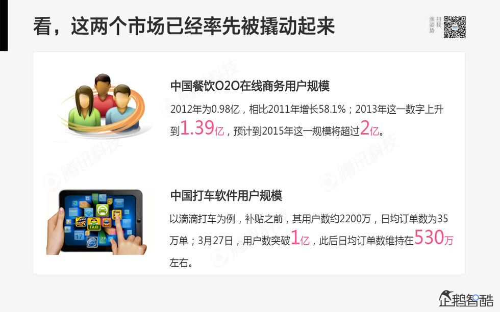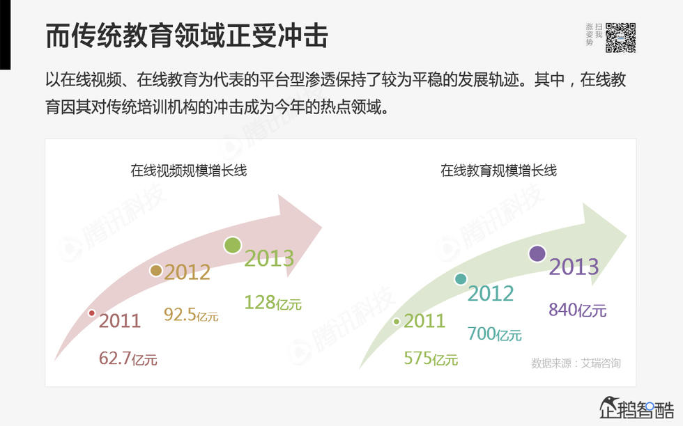 移动互联网大潮正以前所未有之势席卷传统行业。在融合与碰撞之间,行业重塑正在进行。   腾讯科技推出重磅研究报告《2014年互联网跨界趋势报告》,为你解读当下中国移动互联网产业格局。                                                                               |