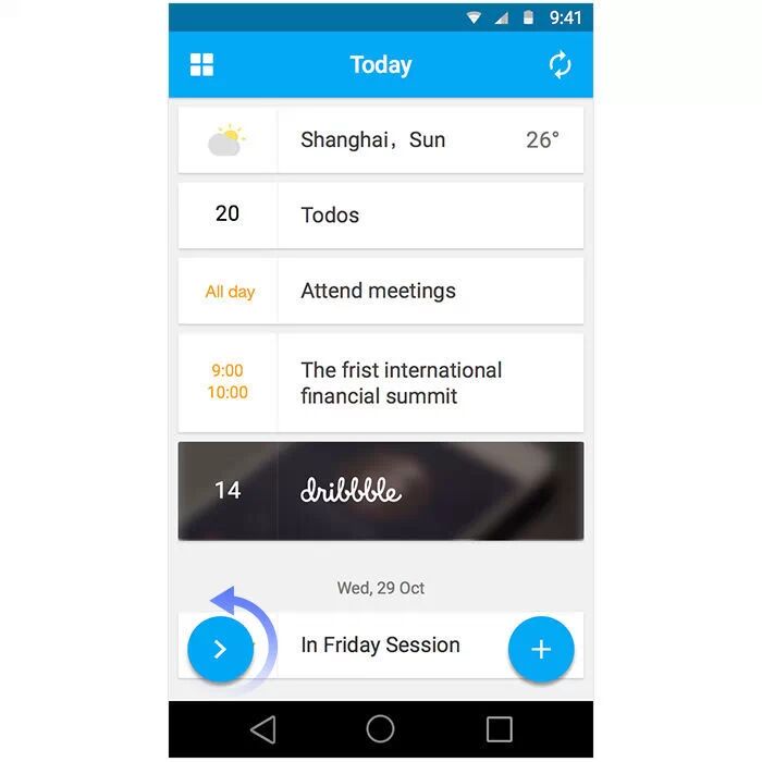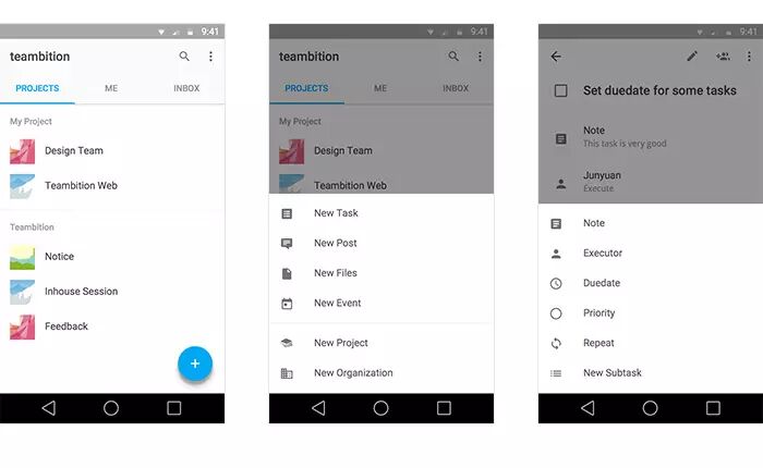编者注:本文来自团队协同工具 Teambition 投稿,Teambition 已经根据 Material Design 重新设计了旗下所有的 Android 客户端产品。在实践过程中,设计和产品团队总结了一些值得分析的要点,与大家分享。 正确用好新元素迎接新“抽屉导航”的到来。是的,就像“抽屉导航”那样,最早被零散使用的交互要素,进入 Android 的设计规范后,会在接下来的时间中被广泛使用,乃至扩散到 iOS 和桌面端。这次同样最具代表性和潜力的两个元素,应该是炙手可热的浮动按钮(FAB,Floating Action Button)和卡片。 浮动按钮目前 Google 伴随 Lolipop 发布的全线产品都带上了全局浮动的按钮,视觉配色上高调突出,图案简明,主要作用是给最重要的动作加上醒目的入口(比如 Google Calendar 中添加日程,Gmail 中写新邮件,等等)。 “浮动”之说是因为,Material Design 的设计指导这次着重关注了z轴(垂直于我们手机平面的那根轴)的存在。按钮按照 z 轴位置划分,有三种类型,扁平(Flat),抬升(Raised),浮动(Floating) 前两种按钮与界面内容一起运动,一般的按钮用扁平的,需要突出的用抬升样式。浮动按钮在z轴上是最高的,加入下方阴影等元素,悬浮于界面上,不随内容移动。 根据 Teambition 后台使用情况的统计,Teambition 移动端最常见的用途主要有这么几项: 响应收件箱中事项进展 添加任务并分配 查看对应事项安排,当 todo list