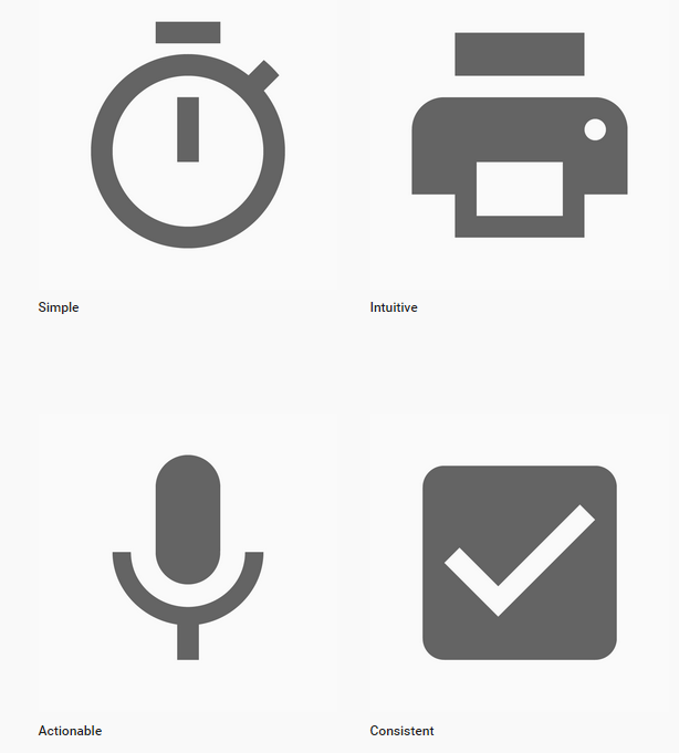 界面切换等场合,要关注动画质量Material Design 强调现实生活中积累的交互预期向数字空间的移植,于是设计指导一方面要求动画的形式必须具备现实中的运动的关键特征,同时也要求在界面转换时,如同现实空间那样,伴随动画动作的发生。 切换动画应如现实那样,具备这些关键特征: 1.有质量和惯性。上下方向运动时,运动受重力的影响,并不是匀速运动,而是类似向上抛物和下落,进而—— 2.进入和离开视野是对速度应该是最高速度,案例如下: 官方指导中还特意给出了不符合这一规律的动画案例,作为对比,这种与自然状况不吻合的运动会额外牵引我们不必要的注意力,增加用户的认知负担,坏案例如下,进入画面后加速,离开前减速: 一脉相承的,考虑降低用户认知负担,官方指导还要求所有的界面切换都应该有承接前后界面的、相关的、有意义的动画作为过渡。 比如列表中点击一个项目后的展开,屏幕不应突然切换,相关内容滑入屏幕,会是一个更好的做法,如果支持手势操作,用户反方向滑动屏幕能够直接回到列表,就更加酸爽了! Teambition 智能日程表中「今天」中的事件: 让信息呈现一致,顺应用户预期应用图标和功能图标呈现应该一致与清晰,包括, 应用图标方面