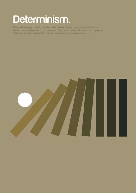 决定论(Determinism) 认为每个事件的发生,包括人类的认知,举止决定和行动,都是因为先前的事而有原因地发生。从原始宇宙开始,一连串的时间注定地,从未中断地发生,自由意志是不可能的。(详见电影《云图》,该电影中的世界是决定论的,不存在自由意志的)。从来就没有孤立的事件,每一个都是前因,也是后果。