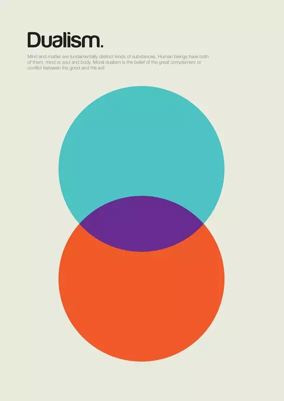 心物二元论(Dualism) 心物二元论的根本论据是人是由“心灵”和“肉体”两部分组成的。意识和物质是两种单独的存在。宗教二元论认为世界是由“善”与“恶”两种力量统治的。