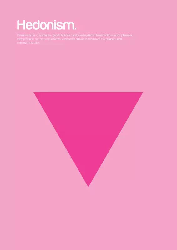 享乐主义/快乐主义(Hedonism) 快乐是唯一固有的,本质是好的存在。每一样行为都可以以它制造的快乐与愉悦来衡量其好坏程度。简单地说,享乐主义者在任何时候都在努力让快乐最大化,痛苦最小化,让享乐与痛苦的距离增至最大。
