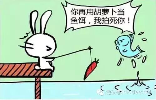2、第一天,小白兔去钓鱼,一无所获。第二天,它又去钓鱼,还是如此。第三天它刚到,一条大鱼从河里跳出来,大叫:你要是再敢用胡萝卜当鱼饵,我就扁死你。